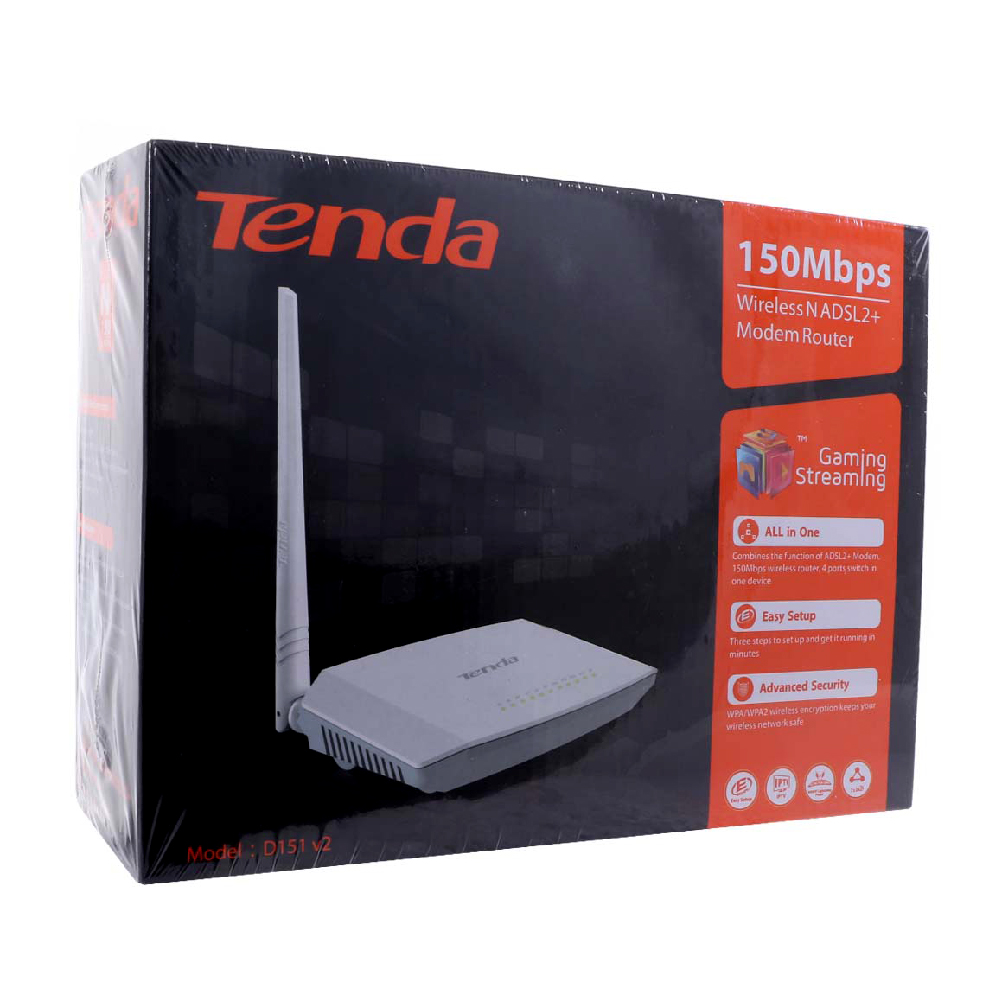 مودم روتر «D151 V2» محصولی از برند «تندا» (Tenda) است. این محصول میتواند در نقش چند دستگاهِ کاربردی شبکه انجاموظیفه کند و نقش یک مودم و روتر باسیم و بیسیم را برعهده داشته باشد. با داشتن این دستگاه میتوانید یک مودم ADSL2+، یک روتر بیسیم و یک سوییچ چهار پورت را در یک محصول در اختیار داشته باشید. داشتن قابلیتهایی همچون WPS، IPTV، نصب آسان و TR069 بر ارزش این محصول افزوده است. مودم روتر D151 V2 از استاندارد بیسیم IEEE 802.11n پشتیبانی میکند و سرعت انتقال بیسیم تا 150 مگابیت بر ثانیه را به همراه میآورد. این پهنای باند برای دسترسی سریع به اینترنت، به اشتراکگذاشتن فایل صوتی و تصویری در شبکهی خانگی و استفادهی اشتراکی از پرینتر کاملا جوابگوست. شبکهی بیسیم این مودم توسط یک آنتن خارجی با قدرت 5dBi ایجاد میشود و میتواند تمام مساحت یک منزل مسکونی را پوشش دهد. مودم D151 V2 با در اختیار داشتن فناوری MIMO از بازتابهای سیگنال بیسیم برای کاهش نقاط کور بیسیم استفاده میکند و عملکرد بهتر شبکهی بیسیم، نرخ انتقال خوب، پایداری سیگنال و پوششدهی بالا را به همراه میآورد. این مودم روتر در برابر صاعقه هم مقاوم است و میتواند ولتاژی تا 6000 ولت را تحمل کند. مقاومت D151 V2 در برابر صاعقه، آن را برای استفاده در مناطقی که دچار صاعقههای مکرر میشوند، مناسب کرده است.